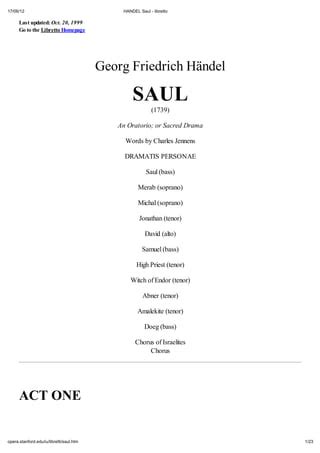 Handel Saul Libretto . Libretto by charles jennens, based on 1 samuel. The document summarizes act one of handel's oratorio saul.